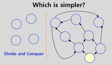 문제 해결책을 관리함에 있어 위 도표에서 어느 쪽이 더 심플하게 보이는가? 왼쪽은 문제 쪼개기를 통해 4개의 관리 포인트를 찾은 그림이다. 오른쪽은 8개 관리 포인트가 있으나 화살표로 다 연결되어 있다. 이 화살표는 문제를 엮기 위한 인과관계의 방향을 제시하고 있다. 화살표의 시작점은 원인이며, 종착점은 결과로써 원인과 결과를 찾아 연결시킨 것이다. 이처럼 쪼개진 문제를 엮는 과정을 통해 오른쪽 도표는 단 1개의 관리 포인트(노란색)만 남게 된다. 복잡한 문제를 원인과 결과로 엮어 냄으로써 왼쪽보다 심플하다. 올바른 인과관계를 찾아 문제를 구조화하여 문제 해결의 실마리를 찾아낸 것이다.