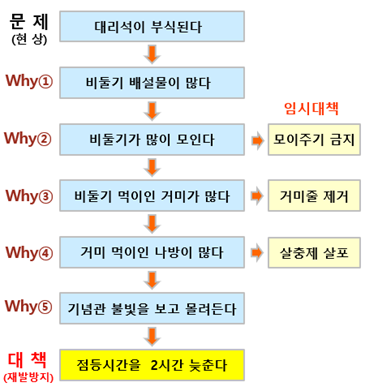 기념관 대리석 부식의 원인을 심층적으로 분석한 결과, 황혼 무렵 전등을 일찍 켜서 주변의 나방이 몰려든 것임을 밝혀냈다. 따라서 대리석 부식의 해결책으로 “기념관 점등을 2시간 늦게 켜기”라는 뜻 밖의 참 원인(Root Cause)을 찾아낸 사례이다.